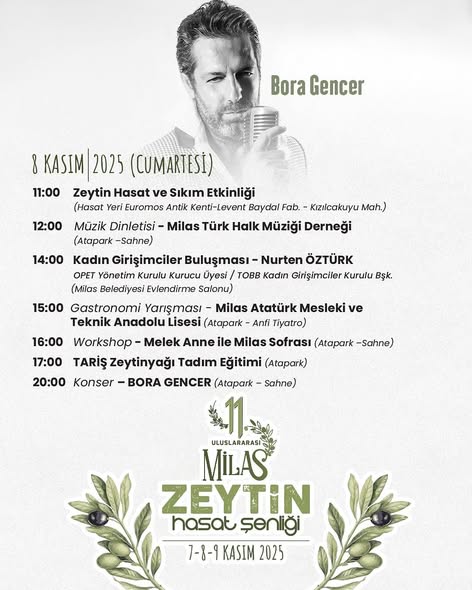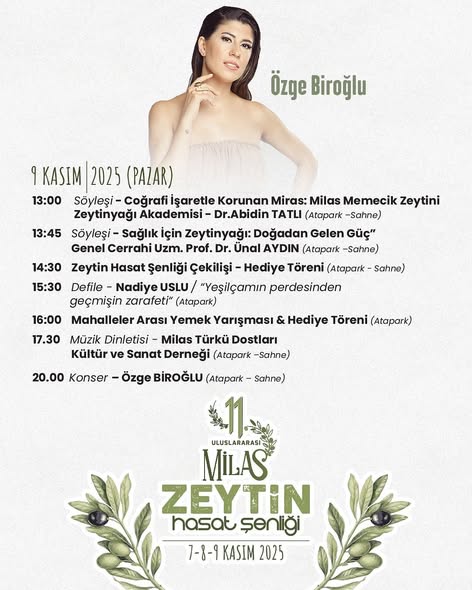 Milas’ın tanıtımına katkı sağlayan ve üreticilerimizi hem bilgilendirici hem de destekleyici etkinliklerin gerçekleşeceği Zeytin Hasat Şenliği’nde konserler, dinletiler, söyleşiler, zeytin hasat ve sıkım etkinliği , tadım eğitimi, workshoplar, defile, yarışmalar ve sürpriz çekilişler, yapılacak.