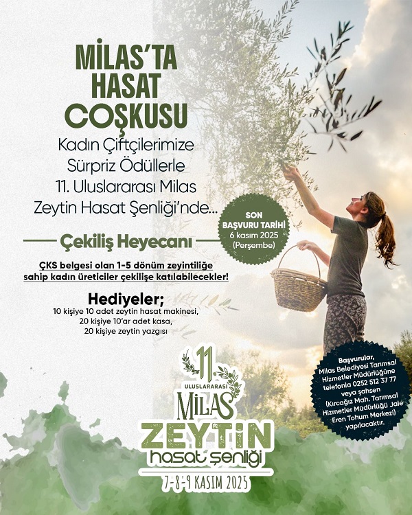Başvuruların Milas Belediyesi Tarımsal Hizmetler Müdürlüğü’nün (0252) 512 37 77 numaralı telefonuna ya da Kırcağız Mahallesi Tarımsal Hizmetler Müdürlüğü Jale Eren Yerel Tohum Merkezi’ne şahsen yapılacağı çekilişte 10 kadın üreticiye 10 adet zeytin hasat makinesi, 20 kadın üreticiye 10’ar adet kasa ve 20 kadın üreticiye ise zeytin yazgısı hediye edilecek.